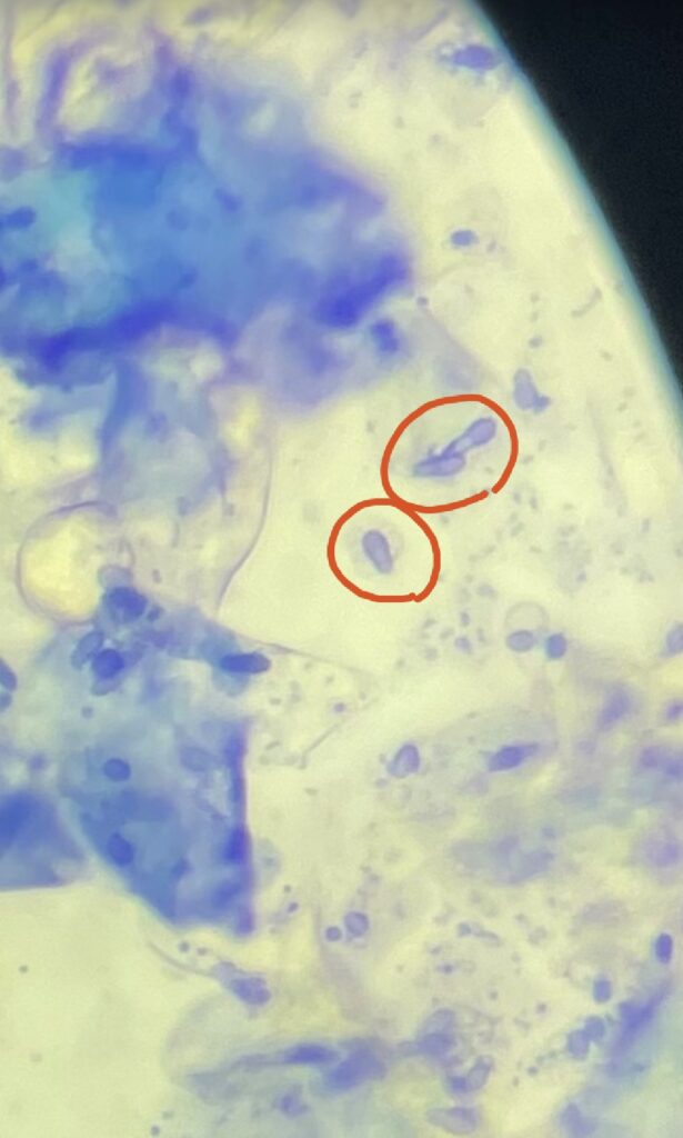 犬の皮膚に常在する酵母菌という真菌の一種で、過剰に増殖することで発症します。