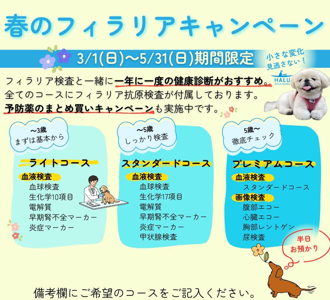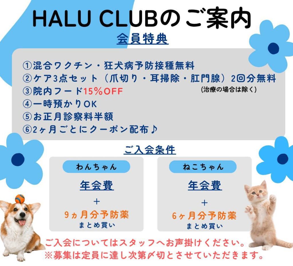 【HALUクラブのご案内🌸】予防薬はまとめ買いがお得✨️日頃の気になる症状も、この機会にぜひご相談ください🐶🐱 2026.04.22 Tweet Share Hatena Pocket RSS feedly Pin it 【春の予防スタート🐶】予防薬はまとめ買いがお得🌸猫ちゃんの気になる症状も、この機会にぜひご相談ください🐱✨️ 前の記事